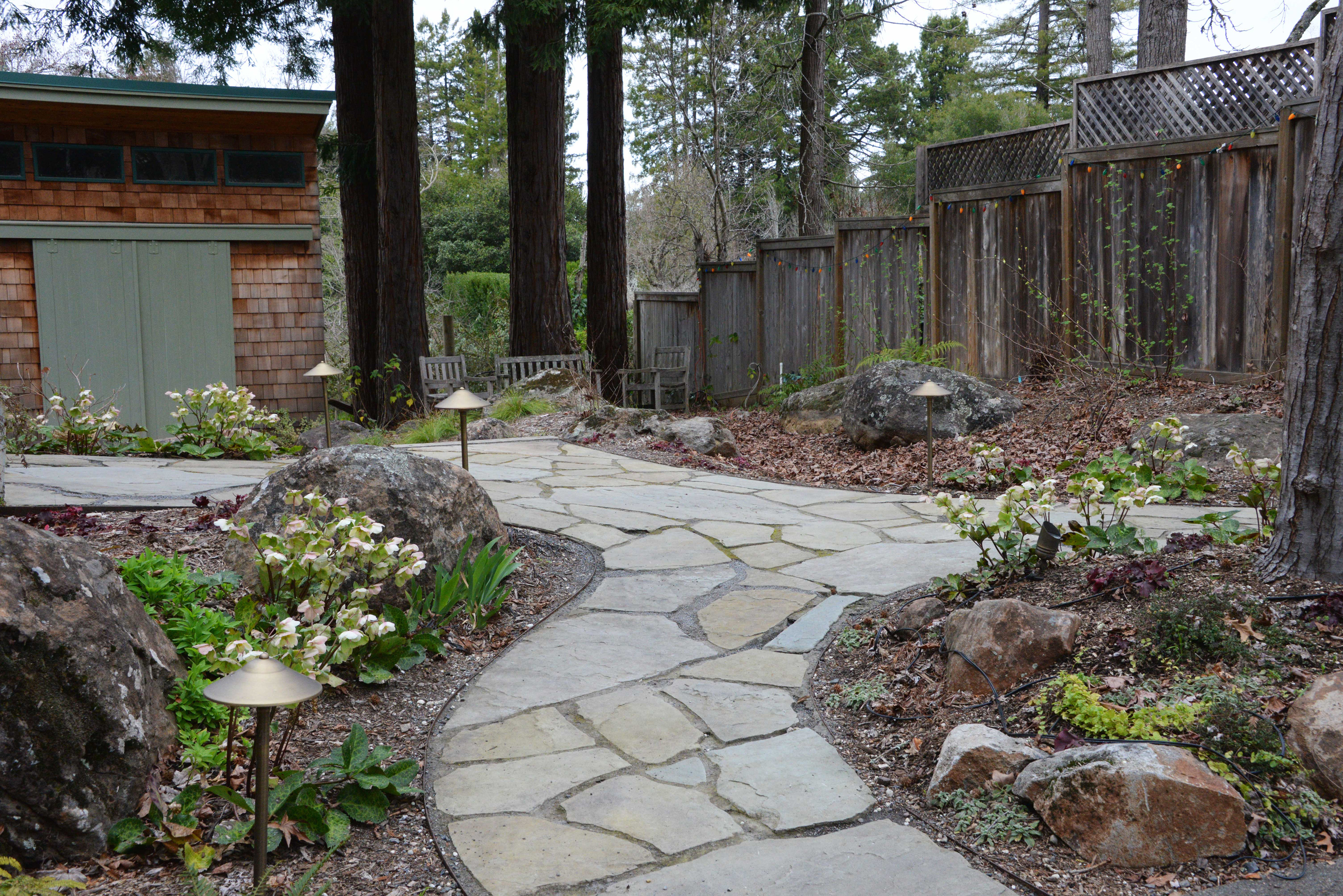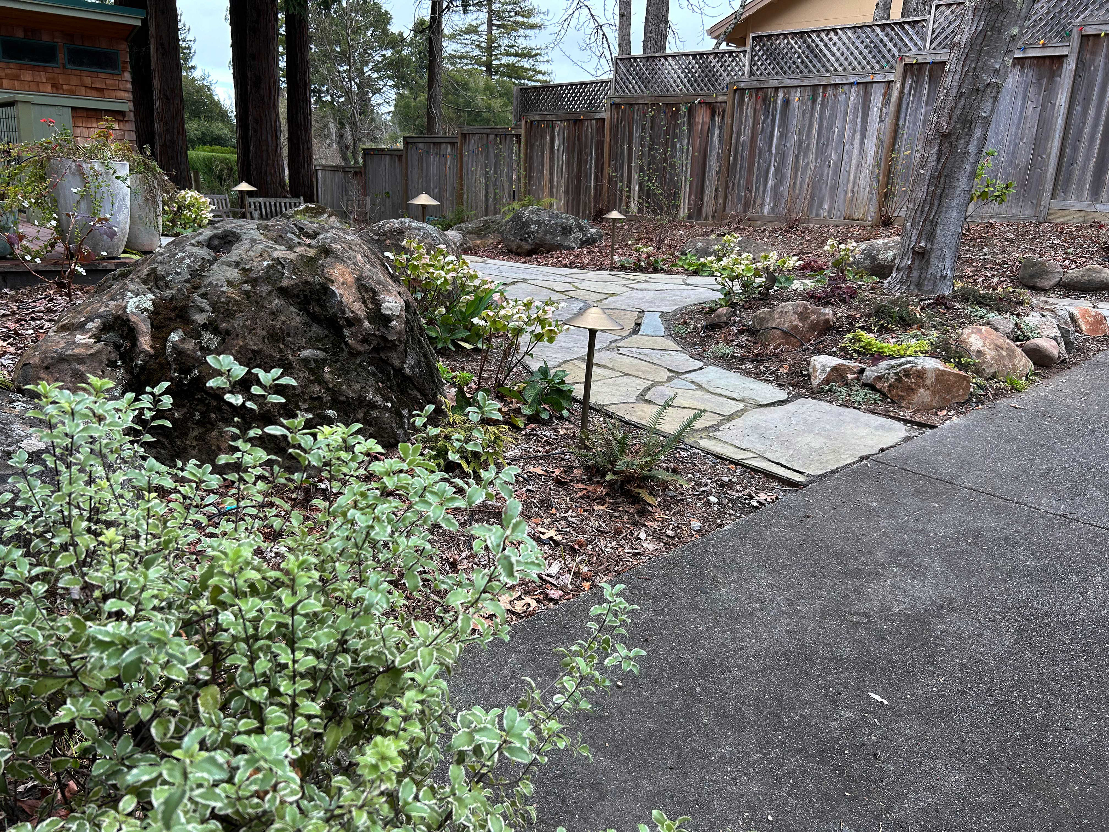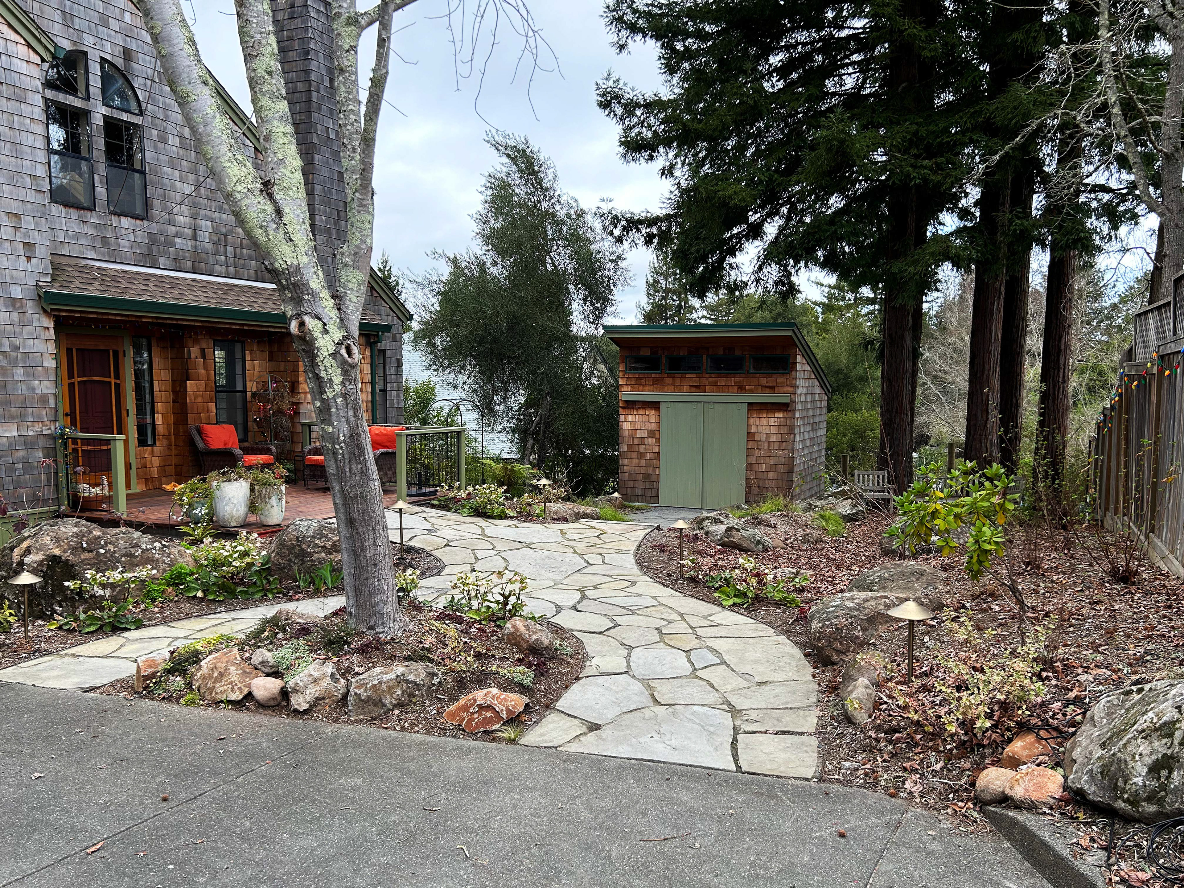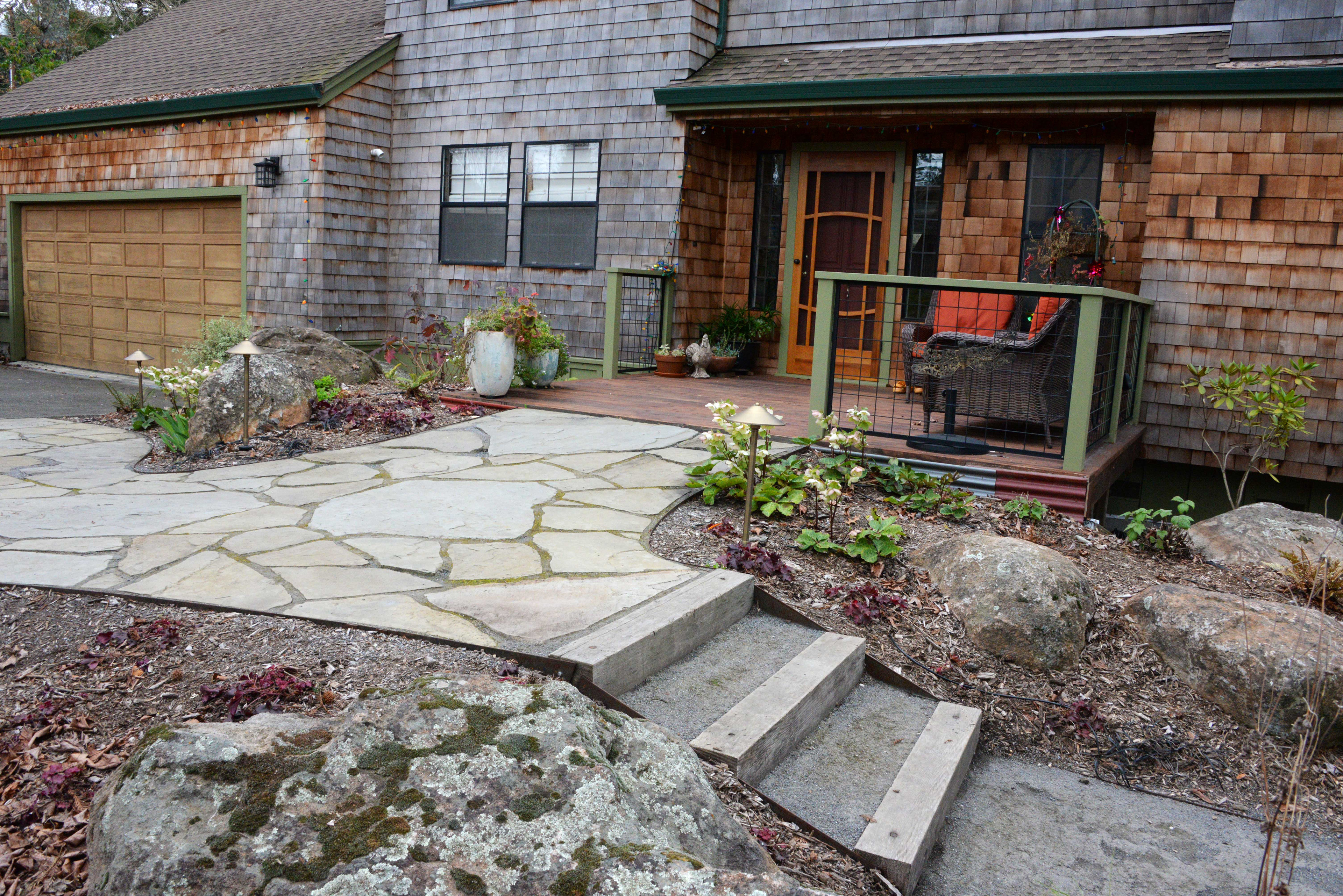 Adjusting an existing design provided level entry access and colorful shady plantings to match the beauty of this owner-built home.