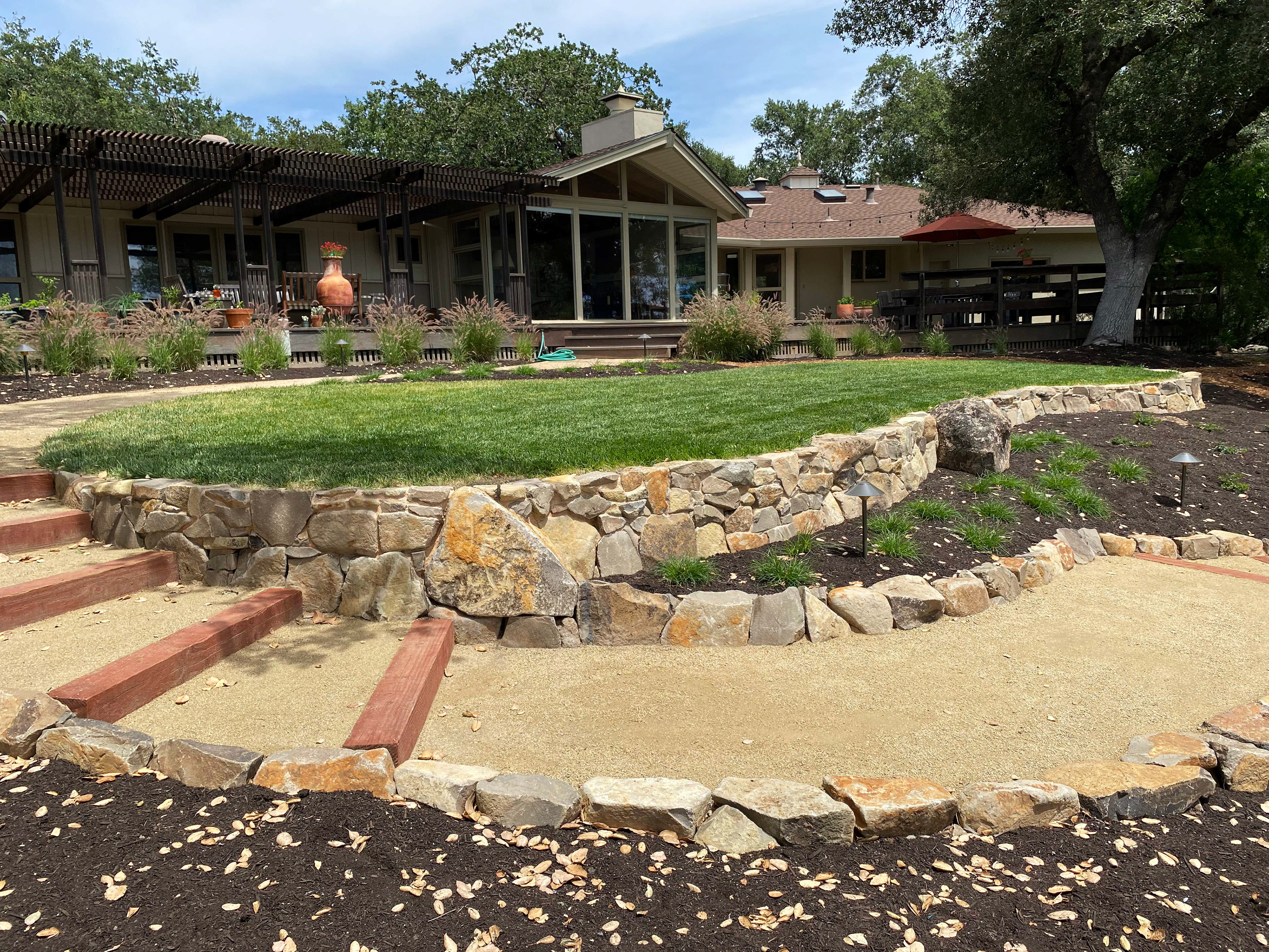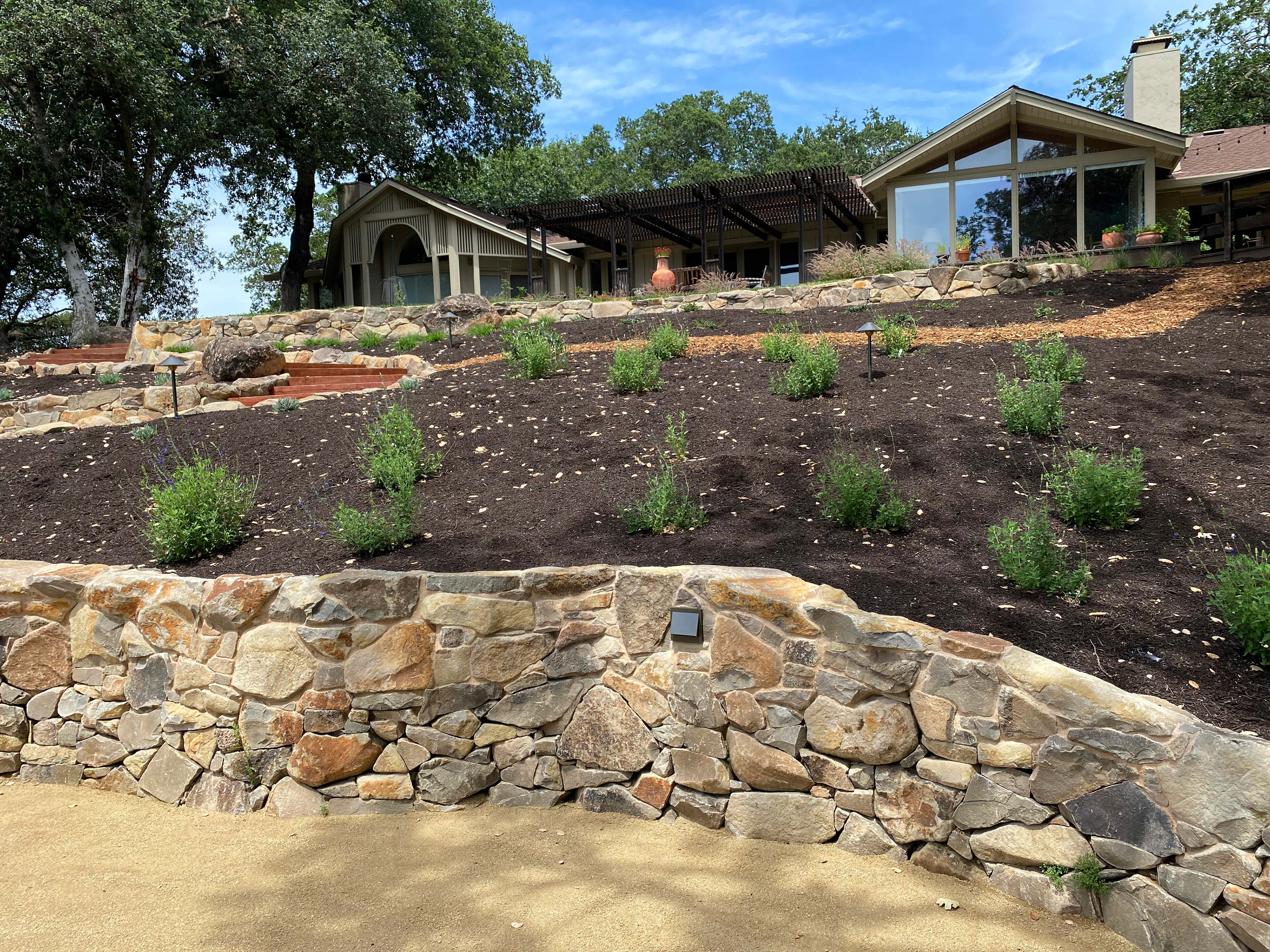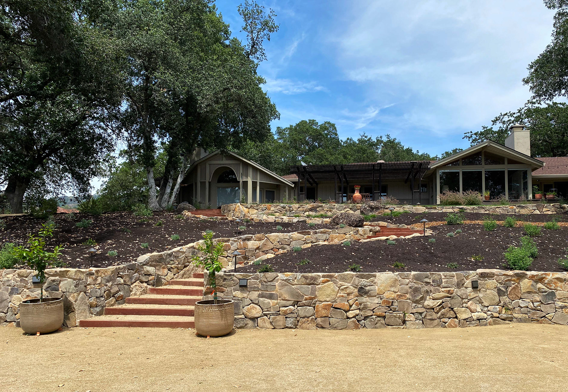 Crafted stone walls anchor an eroding hillside, with weaving stairways that lead to the new game and entertainment terrace.